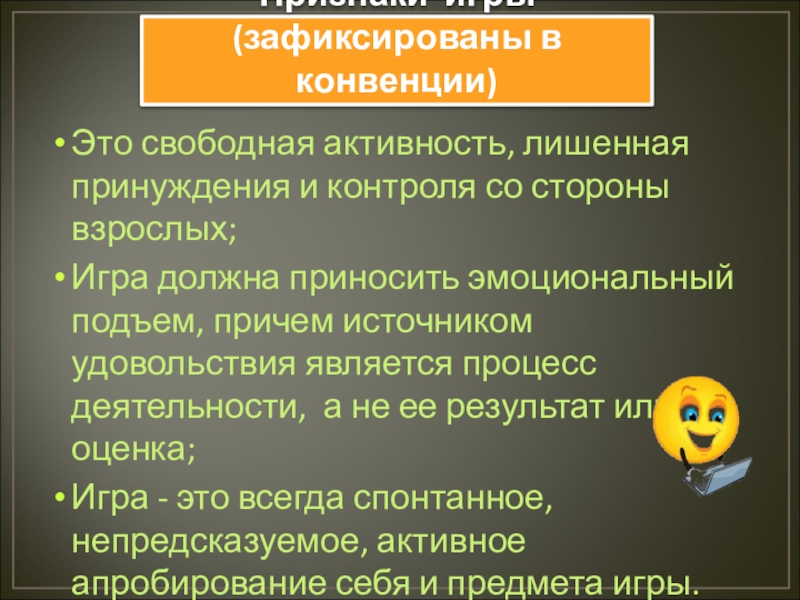 Игра должна приносить эмоциональный подъем, причем источником удовольствия является процесс деятельности, а не ее результат или оценка;