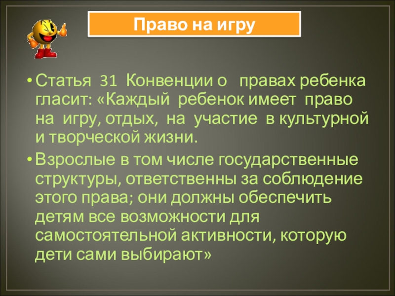 Взрослые в том числе государственные структуры, ответственны за соблюдение этого права; они должны обеспечить детям все возможности для самостоятельной активности, которую дети сами выбирают»