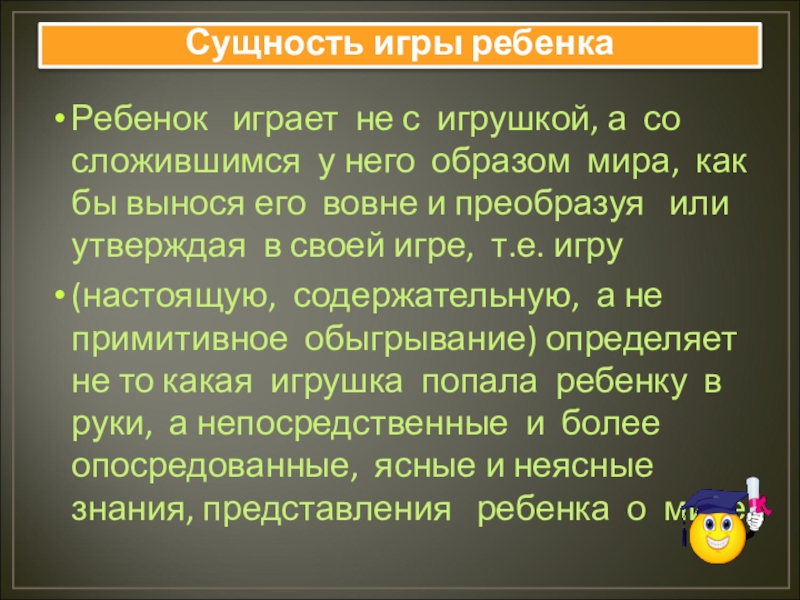 (настоящую, содержательную, а не примитивное обыгрывание) определяет не то какая игрушка попала ребенку в руки, а непосредственные и более опосредованные, ясные и неясные знания, представления ребенка о мире
