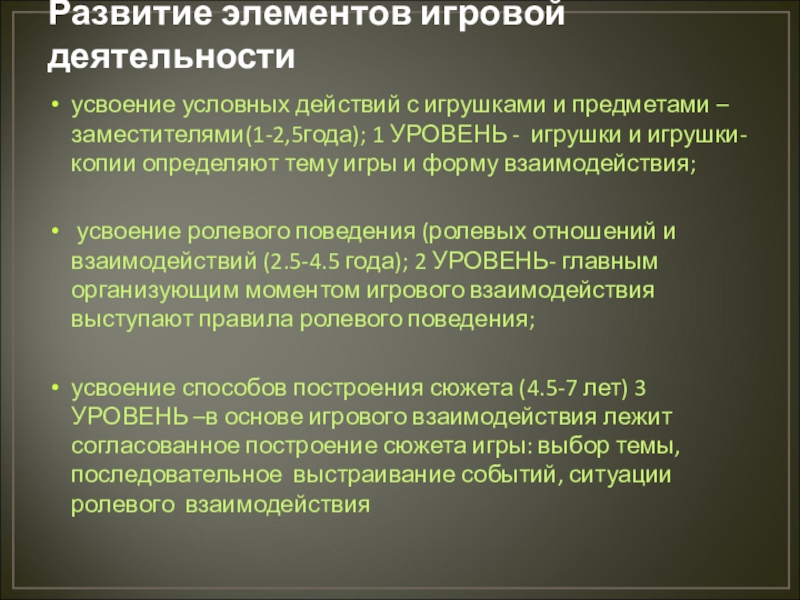 усвоение ролевого поведения (ролевых отношений и взаимодействий (2.5-4.5 года); 2 УРОВЕНЬ- главным организующим моментом игрового взаимодействия выступают правила ролевого поведения;