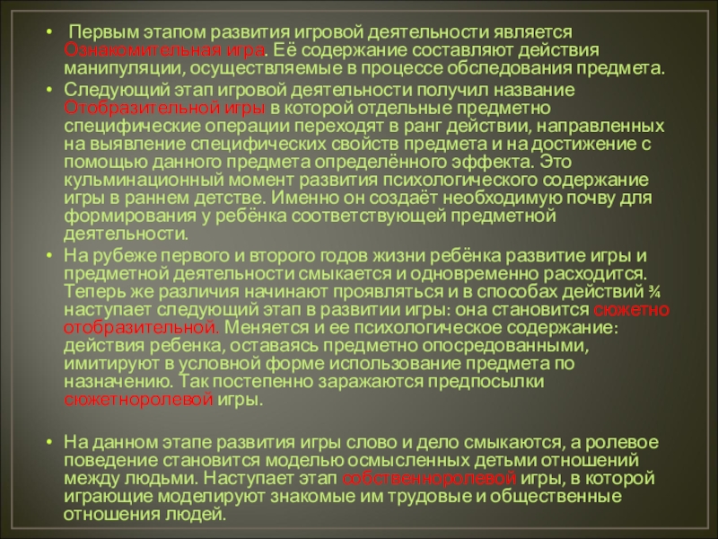 Слайд 14 Первым этапом развития игровой деятельности является Ознакомительная игра. Её содержание