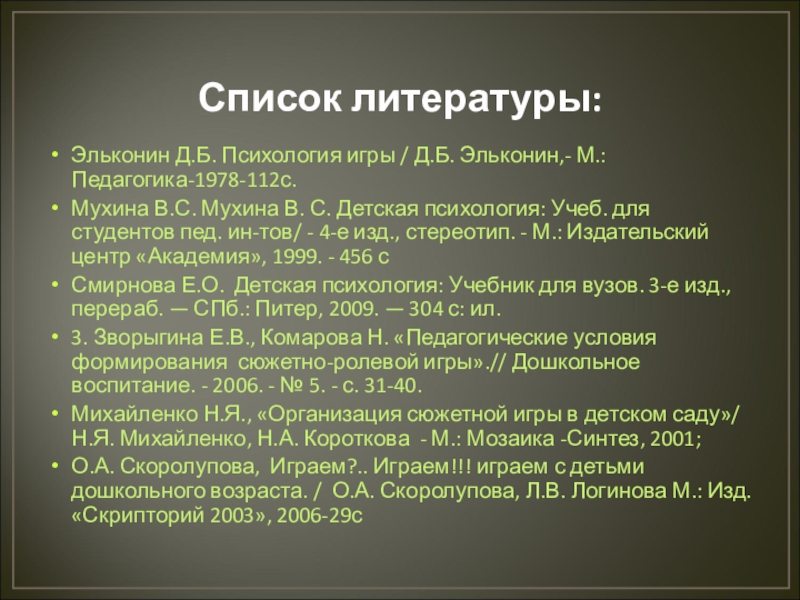 3. Зворыгина Е.В., Комарова Н. «Педагогические условия формирования сюжетно-ролевой игры».// Дошкольное воспитание. - 2006. - № 5. - с. 31-40.