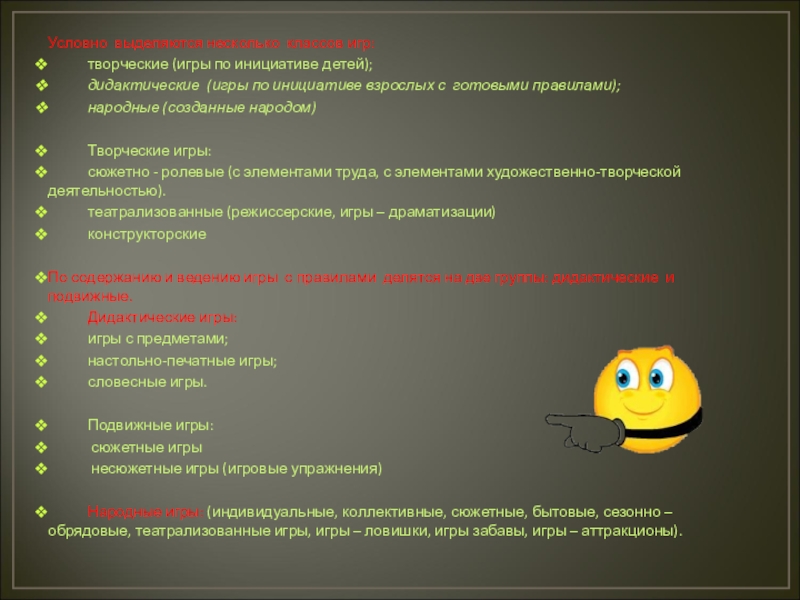 Народные игры: (индивидуальные, коллективные, сюжетные, бытовые, сезонно – обрядовые, театрализованные игры, игры – ловишки, игры забавы, игры – аттракционы).