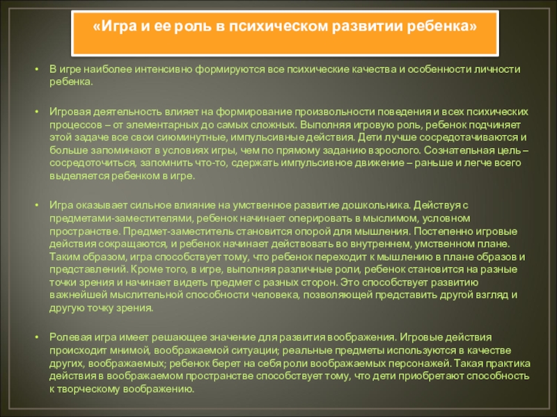 Огромное значение игры для развития всех психических процессов и личности ребенка в целом дает основание считать, что именно эта деятельность является в дошкольном возрасте ведущей.