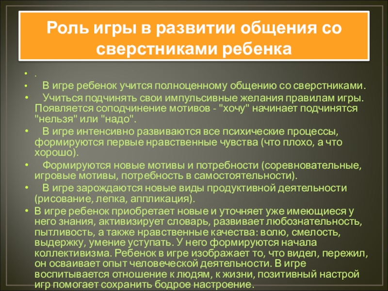 Слайд 9Роль игры в развитии общения со сверстниками ребенка