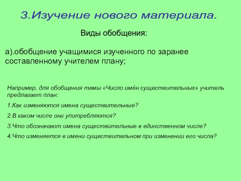 а).обобщение учащимися изученного по заранее составленному учителем плану;