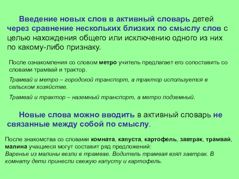 После ознакомления со словом метро учитель предлагает его сопоставить со словами трамвай и трактор.