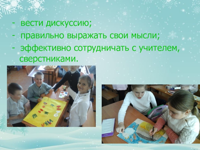 - вести дискуссию;- правильно выражать свои мысли;- эффективно сотрудничать с учителем, сверстниками.