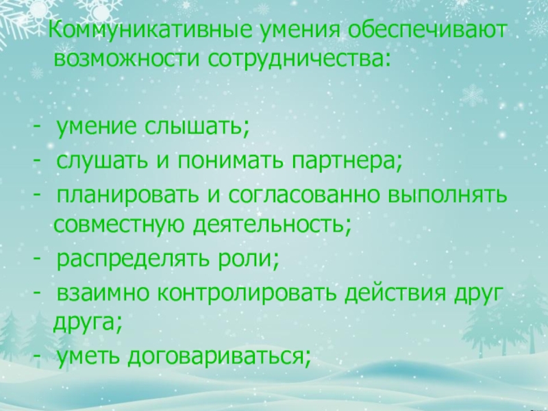 Коммуникативные умения обеспечивают возможности сотрудничества:- умение слышать;- слушать и понимать партнера;- планировать и согласованно выполнять совместную