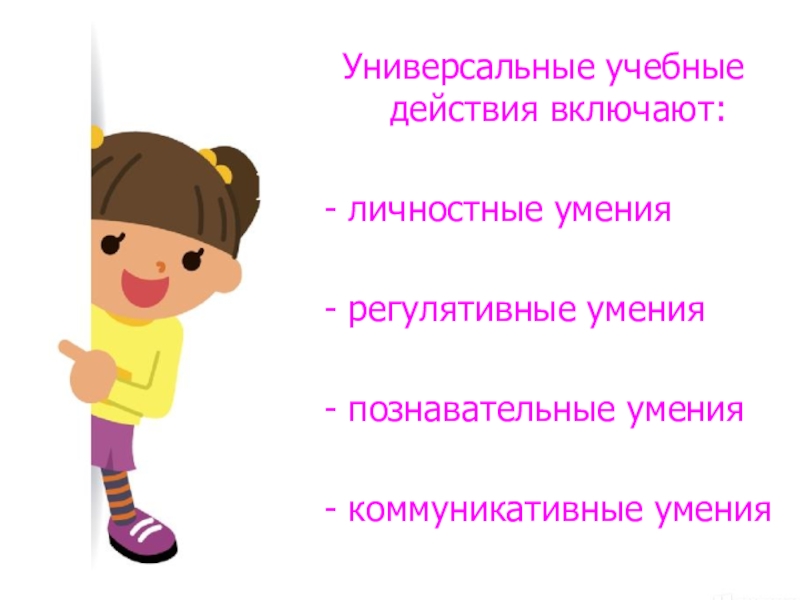 Универсальные учебные действия включают:   - личностные умения   - регулятивные умения   -