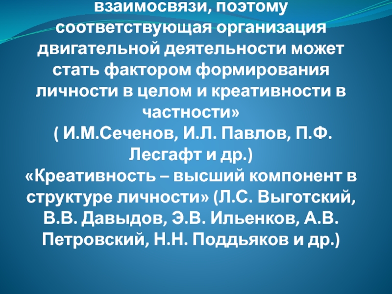 взаимосвязи, поэтому соответствующая организация двигательной деятельности может стать фактором формирования личности в целом и креативности в частности» ( И.М.Сеченов, И.Л. Павлов, П.Ф. Лесгафт и др.) «Креативность – высший компонент в структуре личности» (Л.С. Выготский, В.В. Давыдов, Э.В. Ильенков, А.В. Петровский, Н.Н. Поддьяков и др.)