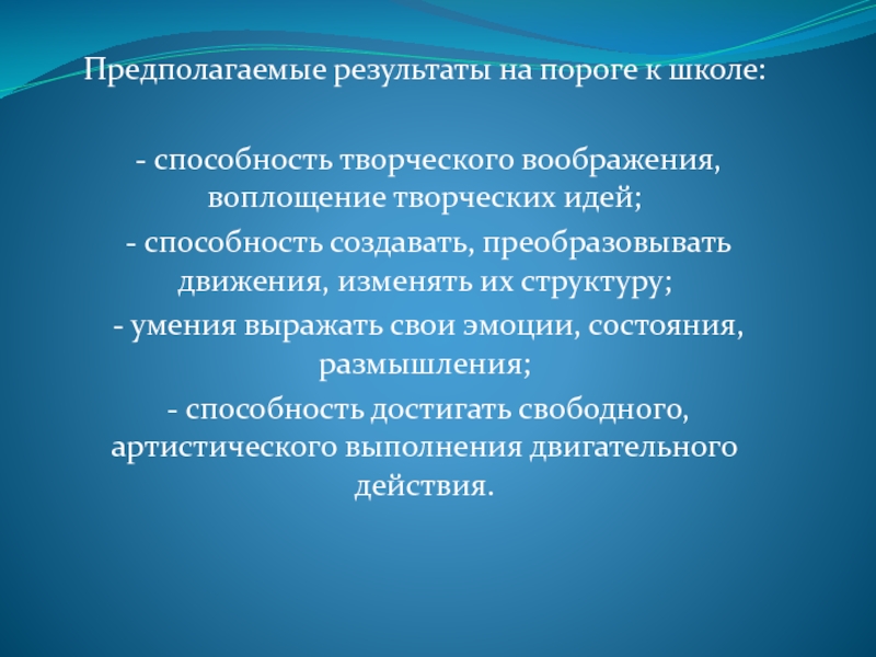 Предполагаемые результаты на пороге к школе: - способность творческого воображения, воплощение творческих идей; - способность создавать, преобразовывать