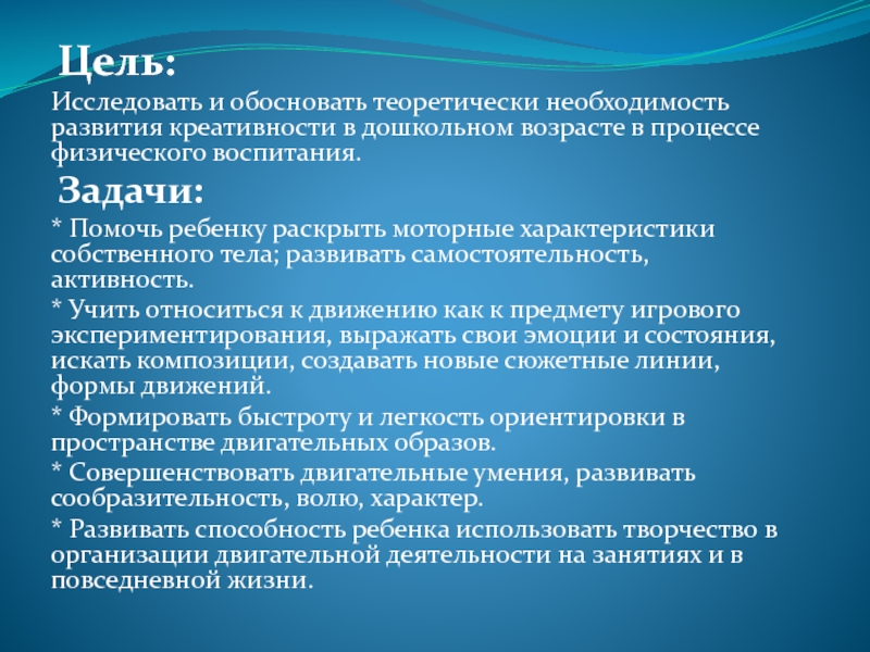 Цель:Исследовать и обосновать теоретически необходимость развития креативности в дошкольном возрасте в процессе физического воспитания. Задачи:* Помочь ребенку раскрыть моторные характеристики собственного тела; развивать самостоятельность, активность.* Учить относиться к движению как к предмету игрового экспериментирования, выражать
