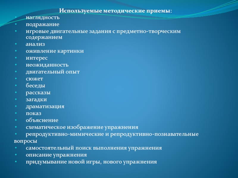 Используемые методические приемы:наглядностьподражаниеигровые двигательные задания с предметно-творческим содержаниеманализоживление картинкиинтереснеожиданностьдвигательный опытсюжетбеседырассказызагадкидраматизацияпоказобъяснениесхематическое изображение упражнениярепродуктивно-мимические и репродуктивно-познавательные вопросысамостоятельный поиск выполнения