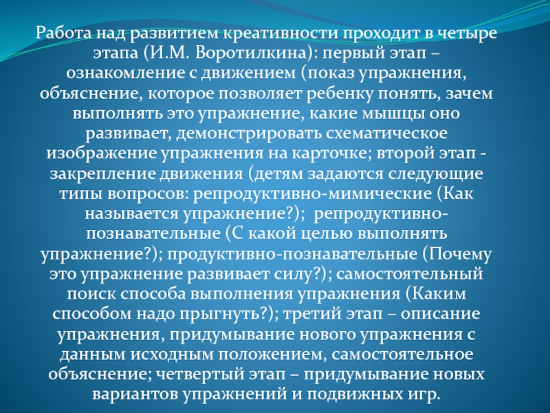 Работа над развитием креативности проходит в четыре этапа (И.М. Воротилкина): первый этап – ознакомление с движением (показ
