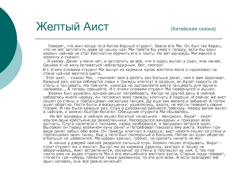 И с этими словами студент Ми вынул из кармана кусок желтого мела и нарисовал на стене чайной желтого аиста.