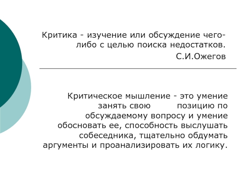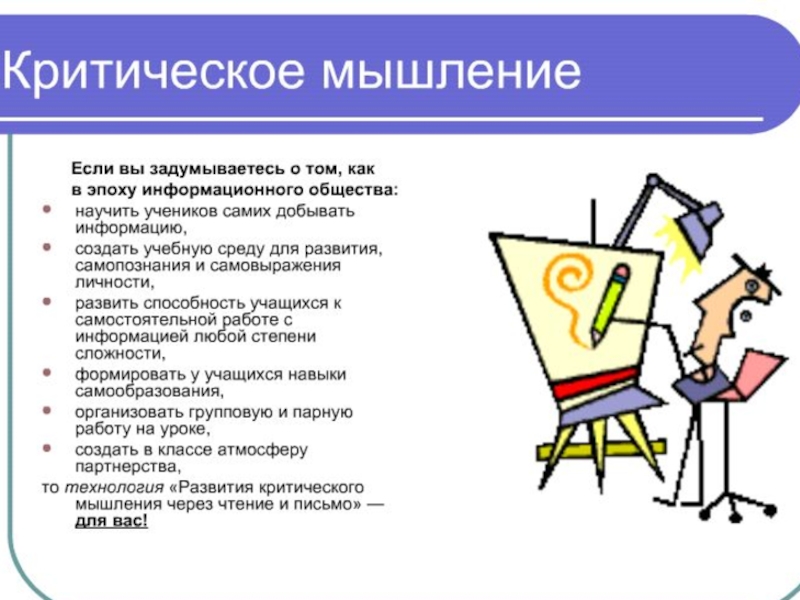 Критическое мышление - это умение занять свою позицию по обсуждаемому вопросу и умение обосновать ее, способность выслушать собеседника, тщательно обдумать аргументы и проанализировать их логику.