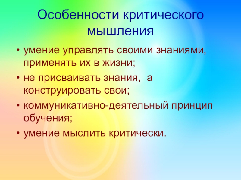 Особенности критического мышленияумение управлять своими знаниями, применять их в жизни;не присваивать знания, а конструировать свои;коммуникативно-деятельный принцип обучения;умение