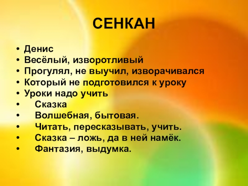 СЕНКАНДенисВесёлый, изворотливыйПрогулял, не выучил, изворачивалсяКоторый не подготовился к урокуУроки надо учить    Сказка    Волшебная, бытовая.   Читать, пересказывать,