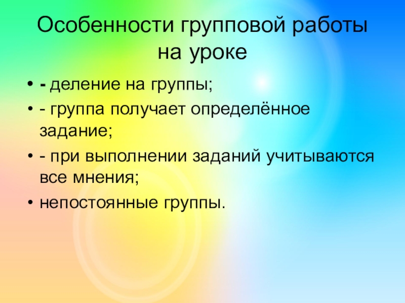 Особенности групповой работы на уроке- деление на группы;- группа получает определённое задание;- при выполнении заданий учитываются все