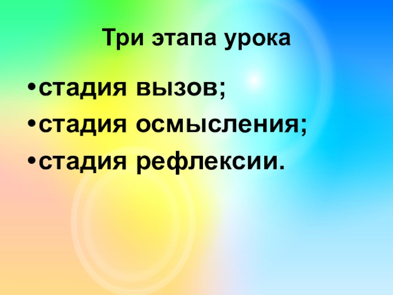 Три этапа урока стадия вызов;стадия осмысления;стадия рефлексии.