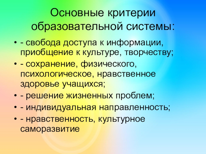Основные критерии образовательной системы:- свобода доступа к информации, приобщение к культуре, творчеству;- сохранение, физического, психологическое, нравственное здоровье