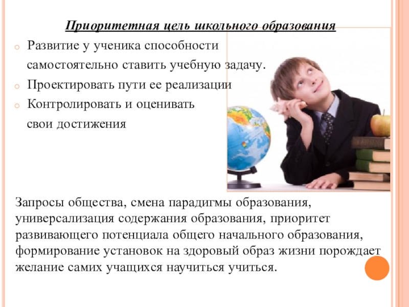 Запросы общества, смена парадигмы образования, универсализация содержания образования, приоритет развивающего потенциала общего начального образования, формирование установок на здоровый образ жизни порождает желание самих учащихся научиться учиться.