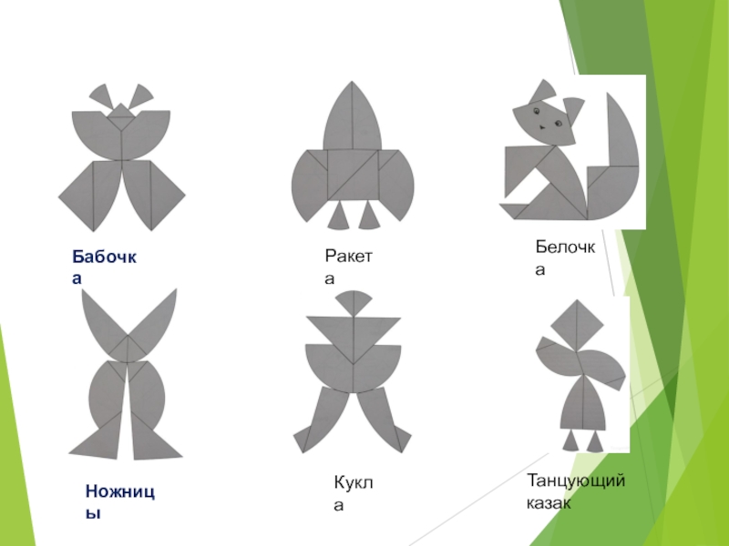треугольники с одной округлой стороной и трапеции с одной округлой стороной, что позволяет составлять силуэты птиц, человека, животных, развивая наблюдательность и геометрическое воображение.