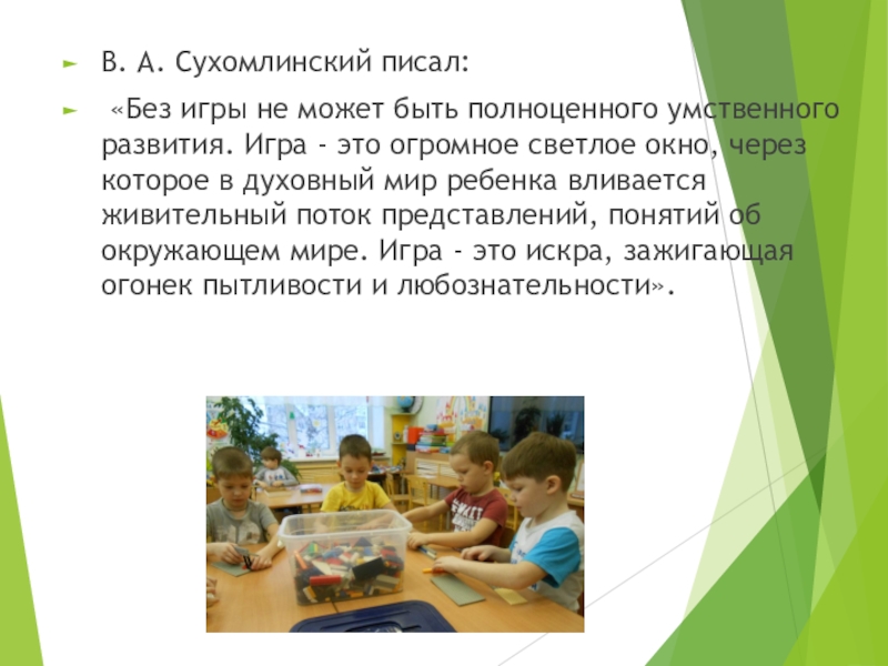 развития. Игра - это огромное светлое окно, через которое в духовный мир ребенка вливается живительный поток представлений, понятий об окружающем мире. Игра - это искра, зажигающая огонек пытливости и любознательности».