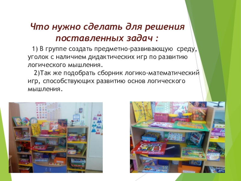 создать предметно-развивающую среду, уголок c наличием дидактических игр по развитию логического мышления.
