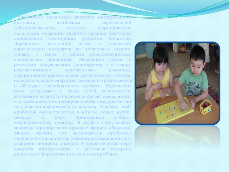 логических операций является важным фактором становления всесторонне развитой личности. Логическое мышление детей с речевыми нарушениями находятся на достаточно низком уровне, в связи с общей недостаточностью психических процессов. Мышление детей с речевыми нарушениями формируется в условиях неполноценного чувственного познания, ограниченной практической деятельности, поэтому их мыслительные операции замедленно развиваются и обладают своеобразными чертами. Недостатки речи затрудняют у таких детей возможность выявления сущности явлений и связей между ними, что наиболее отчетливо проявляется в недоразвитии их словесно-логического мышления. Решение этой проблемы осуществляется в поиске новых путей, методов и форм организации учебно-воспитательного процесса. В связи с этим, особое значение приобретают игровые формы обучения. Можно сказать, что актуальность проблемы определяется важностью логического мышления для развития личности в целом. А дидактическая игра является инструментом, с помощью которого происходит формирование мышления ребенка.