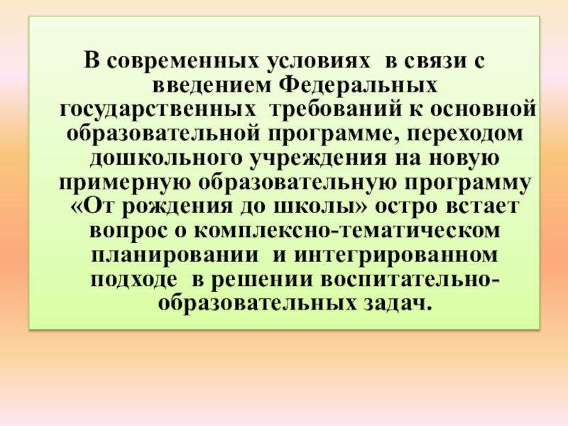 государственных требований к основной образовательной программе, переходом дошкольного учреждения на новую примерную образовательную программу «От рождения до школы» остро встает вопрос о комплексно-тематическом планировании и интегрированном подходе в решении воспитательно-образовательных задач.