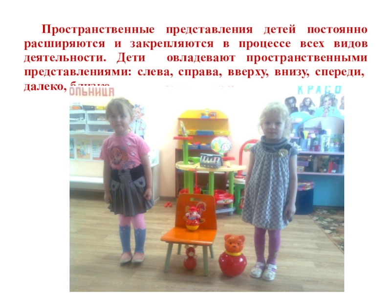 При помощи дидактических игр и упражнений дети овладевают умением определять словом положение того или иного предмета по отношению к другому: « Справа от куклы стоит заяц, слева от куклы – пирамидка.»