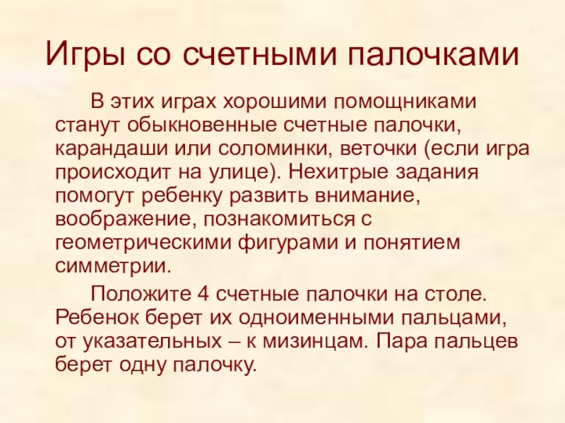 Положите 4 счетные палочки на столе. Ребенок берет их одноименными пальцами, от указательных – к мизинцам. Пара пальцев берет одну палочку.
