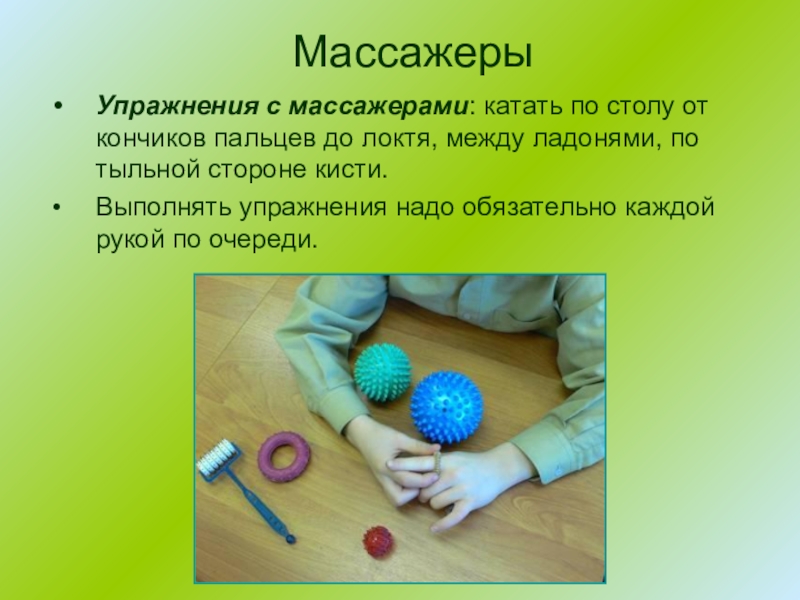 Упражнения с массажерами: катать по столу от кончиков пальцев до локтя,