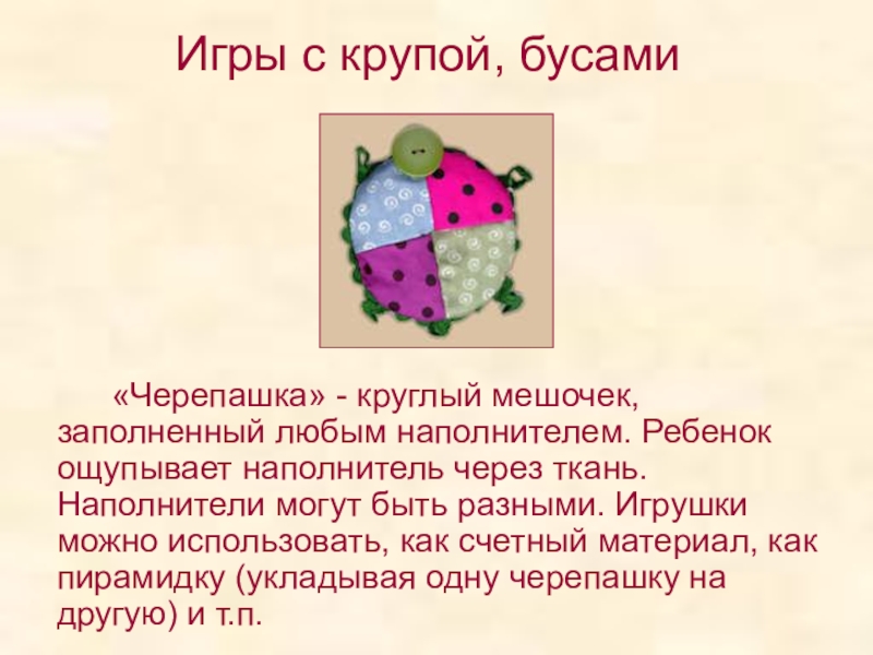 ощупывает наполнитель через ткань. Наполнители могут быть разными. Игрушки можно использовать, как счетный материал, как пирамидку (укладывая одну черепашку на другую) и т.п.