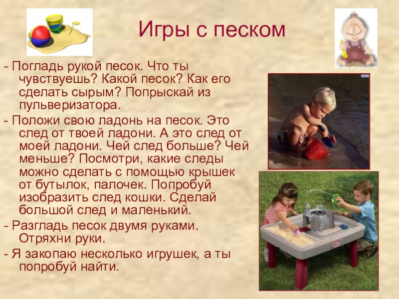 - Погладь рукой песок. Что ты чувствуешь? Какой песок?