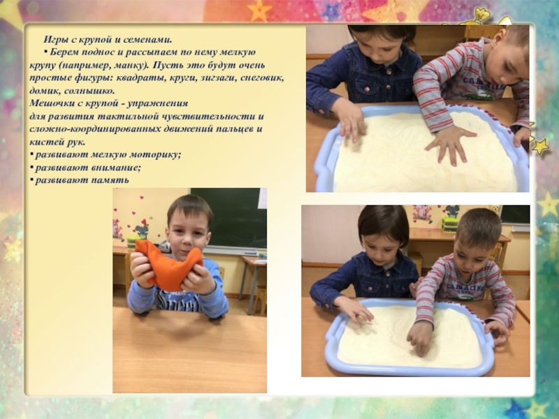 Мешочки с крупой - упражнения для развития тактильной чувствительности и сложно-координированных движений пальцев и кистей рук.