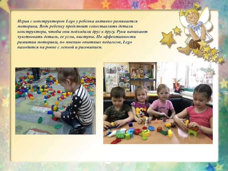 Слайд 9Играя с конструктором Lego у ребенка активно развивается моторика. Ведь ребенку