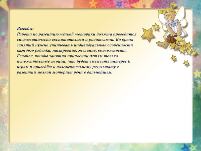 Во время занятий нужно учитывать индивидуальные особенности каждого ребёнка, настроение, желание, возможности. Главное, чтобы занятия приносили детям только положительные эмоции, что будет вызывать интерес к играм и приведёт к положительному результату в развитии мелкой моторики речи в дальнейшем.