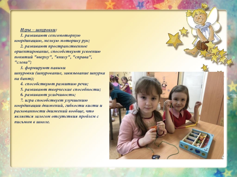 7. игра способствует улучшению координации движений, гибкости кисти и раскованности движений вообще, что является залогом отсутствия проблем с письмом в школе.