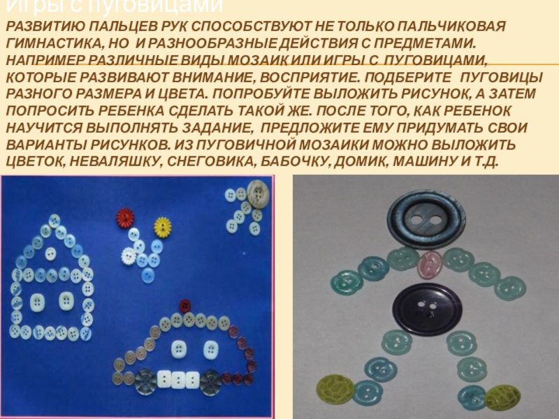 но и разнообразные действия с предметами. Например различные виды мозаик или игры с пуговицами, которые развивают внимание, восприятие. Подберите пуговицы разного размера и цвета. Попробуйте выложить рисунок, а затем попросить ребенка сделать такой же. После того, как ребенок научится выполнять задание, предложите ему придумать свои варианты рисунков. Из пуговичной мозаики можно выложить цветок, неваляшку, снеговика, бабочку, домик, машину и т.д.