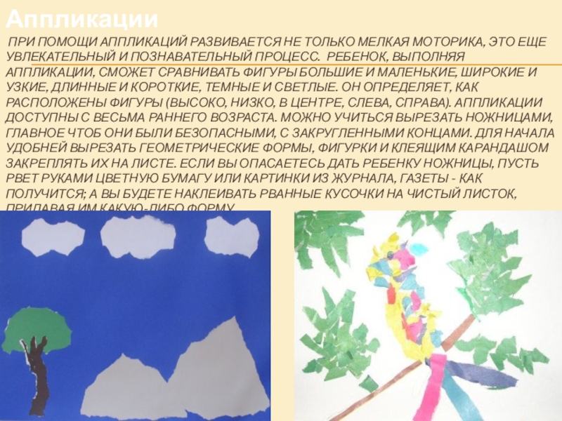 увлекательный и познавательный процесс. Ребенок, выполняя аппликации, сможет сравнивать фигуры большие и маленькие, широкие и узкие, длинные и короткие, темные и светлые. Он определяет, как расположены фигуры (высоко, низко, в центре, слева, справа). Аппликации доступны с весьма раннего возраста. Можно учиться вырезать ножницами, главное чтоб они были безопасными, с закругленными концами. Для начала удобней вырезать геометрические формы, фигурки и клеящим карандашом закреплять их на листе. Если Вы опасаетесь дать ребенку ножницы, пусть рвет руками цветную бумагу или картинки из журнала, газеты - как получится; а вы будете наклеивать рванные кусочки на чистый листок, придавая им какую-либо форму.