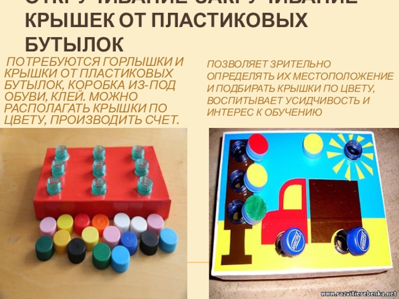Слайд 13Откручивание-закручивание крышек от пластиковых бутылок
