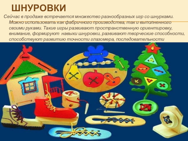использовать как фабричного производства, так и выполненного своими руками. Такие игры развивают пространственную ориентировку, внимание, формируют навыки шнуровки, развивают творческие способности, способствуют развитию точности глазомера, последовательности действий.