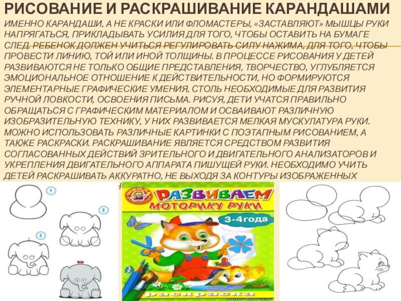 мышцы руки напрягаться, прикладывать усилия для того, чтобы оставить на бумаге след. Ребенок должен учиться регулировать силу нажима, для того, чтобы провести линию, той или иной толщины. В процессе рисования у детей развиваются не только общие представления, творчество, углубляется эмоциональное отношение к действительности, но формируются элементарные графические умения, столь необходимые для развития ручной ловкости, освоения письма. Рисуя, дети учатся правильно обращаться с графическим материалом и осваивают различную изобразительную технику, у них развивается мелкая мускулатура руки. Можно использовать различные картинки с поэтапным рисованием, а также раскраски. Раскрашивание является средством развития согласованных действий зрительного и двигательного анализаторов и укрепления двигательного аппарата пишущей руки. Необходимо учить детей раскрашивать аккуратно, не выходя за контуры изображенных предметов, равномерно нанося нужный цвет.