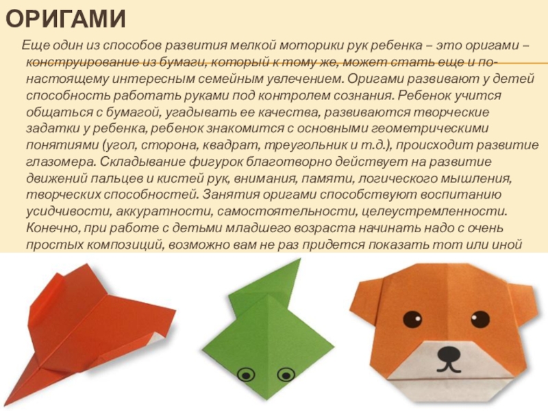 ребенка – это оригами – конструирование из бумаги, который к тому же, может стать еще и по-настоящему интересным семейным увлечением. Оригами развивают у детей способность работать руками под контролем сознания. Ребенок учится общаться с бумагой, угадывать ее качества, развиваются творческие задатки у ребенка, ребенок знакомится с основными геометрическими понятиями (угол, сторона, квадрат, треугольник и т.д.), происходит развитие глазомера. Складывание фигурок благотворно действует на развитие движений пальцев и кистей рук, внимания, памяти, логического мышления, творческих способностей. Занятия оригами способствуют воспитанию усидчивости, аккуратности, самостоятельности, целеустремленности. Конечно, при работе с детьми младшего возраста начинать надо с очень простых композиций, возможно вам не раз придется показать тот или иной прием.