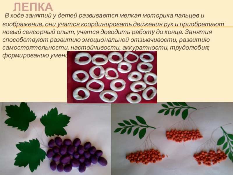 они учатся координировать движения рук и приобретают новый сенсорный опыт, учатся доводить работу до конца. Занятия способствуют развитию эмоциональной отзывчивости, развитию самостоятельности, настойчивости, аккуратности, трудолюбия; формированию умений и навыков в лепке.