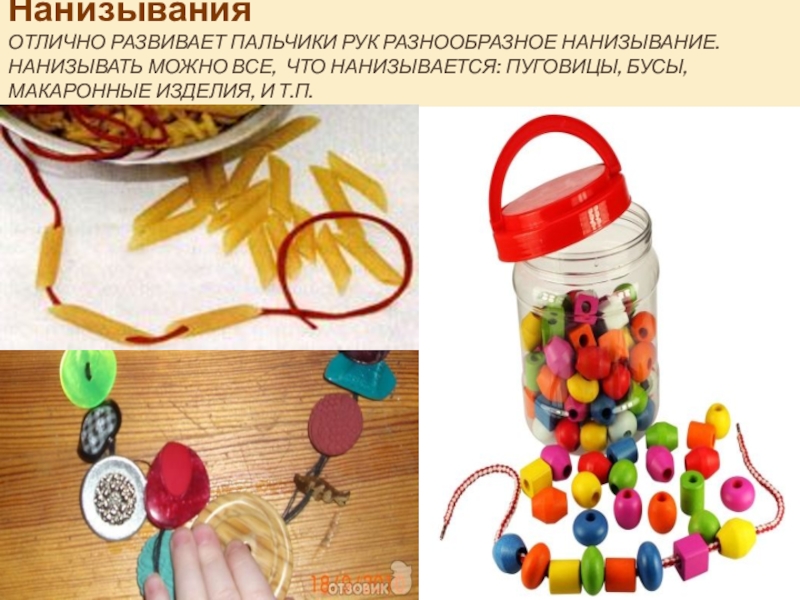 Отлично развивает пальчики рук разнообразное нанизывание. Нанизывать можно все, что