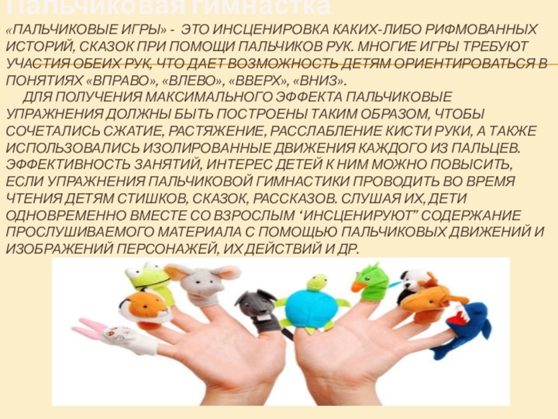 «Пальчиковые игры» - это инсценировка каких-либо рифмованных историй, сказок при помощи пальчиков рук. Многие игры требуют участия обеих рук, что дает возможность детям ориентироваться в понятиях «вправо», «влево», «вверх», «вниз».